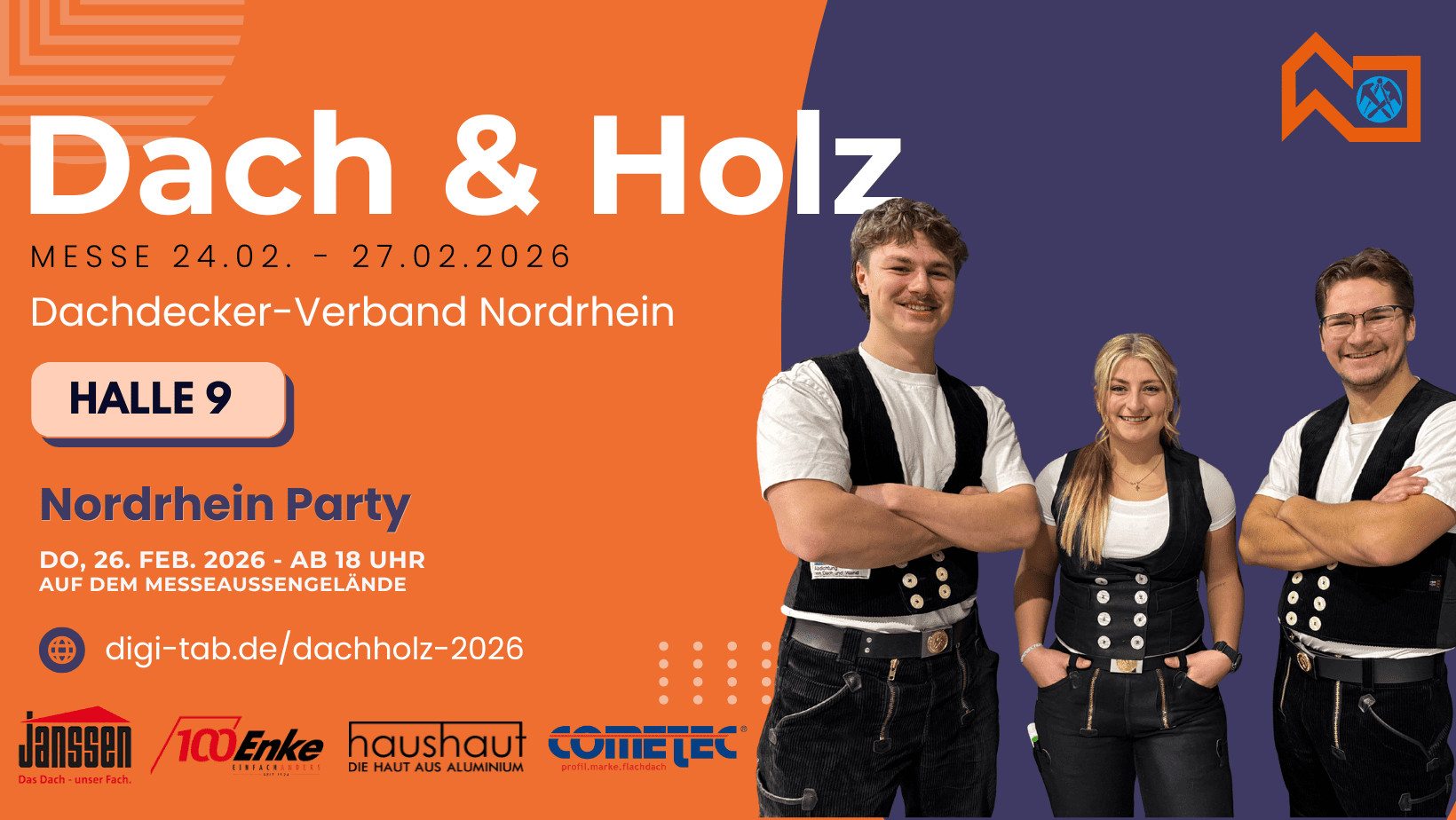Vom 24.–27. Februar 2026 trifft sich die Dachbranche auf der DACH+HOLZ in Köln. Besucht uns in Halle 9: Innungsleben, Ehrenamt, Ausbildung, Beratung, plus Drohnen-Challenge & Nordrhein-Party!