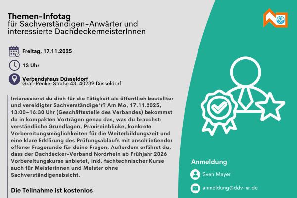 Ergänzend wird auf dem Themen-Infotag darüber informiert werden, dass der Dachdecker-Verband Nordrhein ab dem nächsten Jahr verschiedene Vorbereitungskurse auf die Sachverständigenprüfung anbieten wird. Es werden in diesem Rahmen u. a. fachtechnischen Kurse abgehalten werden, die auch von fachinteressierte Dachdeckermeister und Dachdeckermeisterinnen, die keine Sachverständigkeit anstreben, besucht werden können.